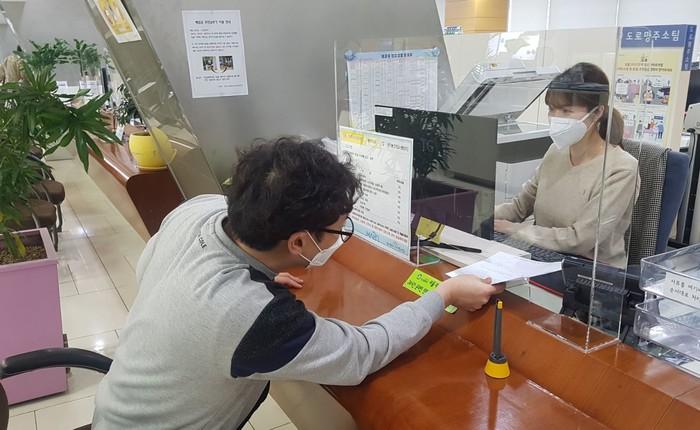 서울 마포구가 '사회적 거리두기' 실천의 일환으로 공무원과 민원인 간 직접적인 접촉을 최소화하기 위해 구청과 동 주민센터 민원창구에 투명 가림막 273개를 설치하고 있다. 사진은 최근 가림막이 설치된 구청 민원실에서 직원이 업무를 보는 모습. (사진제공=마포구청)