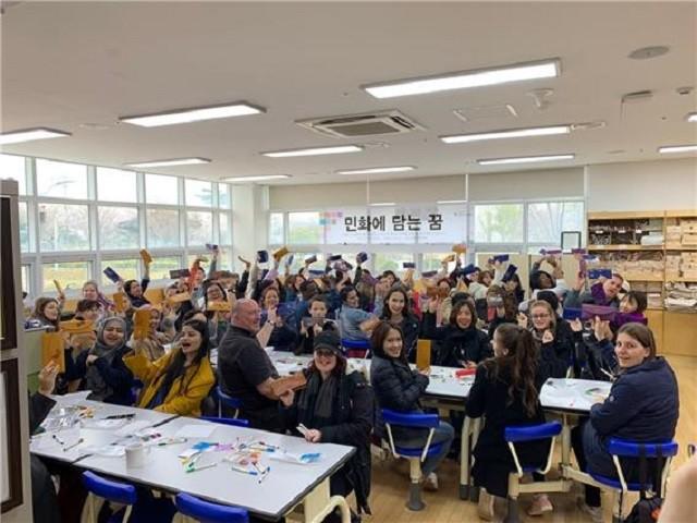 | 강진군 소재 한국민화뮤지엄을 찾은 외국인들이 한국민화 교실 프로그램에 참여한 모습 / 강진한국민화뮤지엄 제공 |