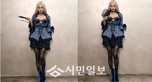 사진 속 한예슬은 블루컬러의 상하의 원피스를 입은 뱀파이어 모습으로 변신한 모습으로 감탄을 자아냈다.