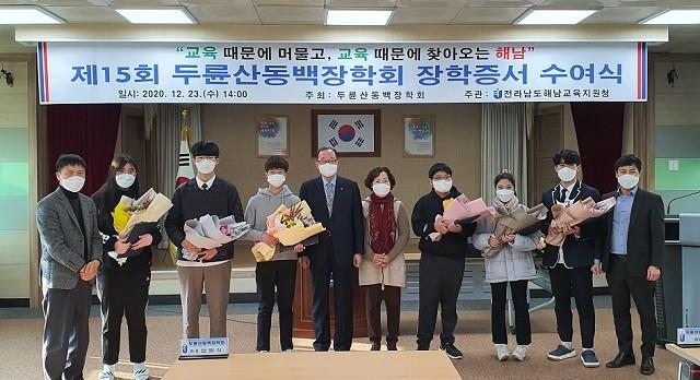 [해남=정찬남 기자] 전라남도해남교육지원청(교육장 장성모)은 지난 23일 (사)한국예총광주연합회 회장이며, ㈜온누리태양광 회장인 두륜산 동백장학회 임원식 대표가 지급하는 제15회 두륜산 동백장학회 장학증서 및 장학금 수여식을 관내 초·중·고 35명 학생을 대상으로 실시했다고 밝혔다.