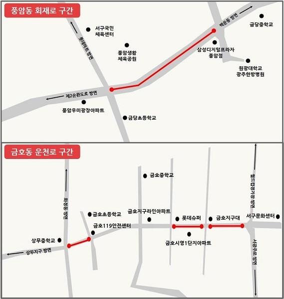 금호동 운천로 구간은 상무중학교 앞 사거리부터 금호119안전센터 사거리까지 풍금사거리 방향 3차로와 운천저수지 방향 1차로를 점유할 예정이다. 금호시영아파트 앞 롯데슈퍼 사거리부터 풍금사거리까지는 중앙선을 중심으로 양방향 2차로를 점유할 예정이며, 5월20일경 8차선에서 4차로만 통행이 가능해진다.