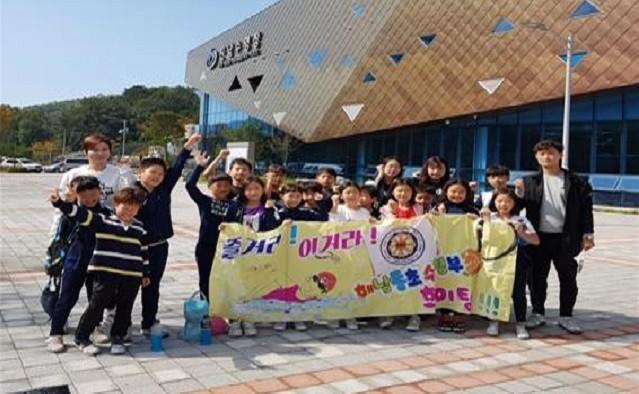 | 해남동초등학교 수영부와 지도교사=사진, 해남동초등학교 제공 |