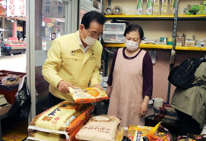 최근 사회적 거리두기 여파로 어려움을 겪고 있는 상인들을 위로하고 현장 목소리를 들으며 소통하기에 나선 정 구청장은 여러 상점을 돌며 상품을 구매하고 코로나 방역에 적극 협조한 전통시장 상인들에게 감사 인사를 전했다.