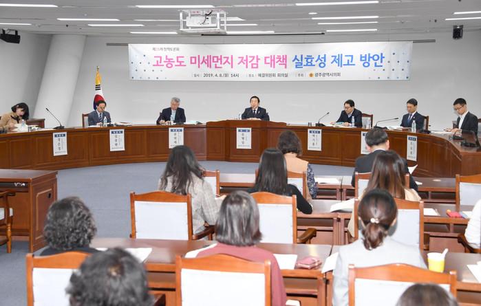 최근 광주광역시의회 주최로 예결위원회 회의실에서 제28차 정책토론회가 열렸다. 이날 정책토론회 안건은 '고농도 미세먼지 저감 대책 실효성 제고 방안'으로 다양한 대안들이 제시됐다. 사진은 정채토론회 진행 모습.(사진제공=광주광역시의회)