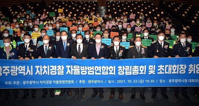 [광주=정찬남 기자] 이용섭 광주광역시장(앞줄 좌측부터 6번)이 지난 22일 오후 시청 대회의실에서 열린 광주광역시 자치경찰 자율방범연합회 출범식에 참석해 유공방범대원에게 표창을 한 후 참석자들과 함께 기념촬영을 하고 있다.