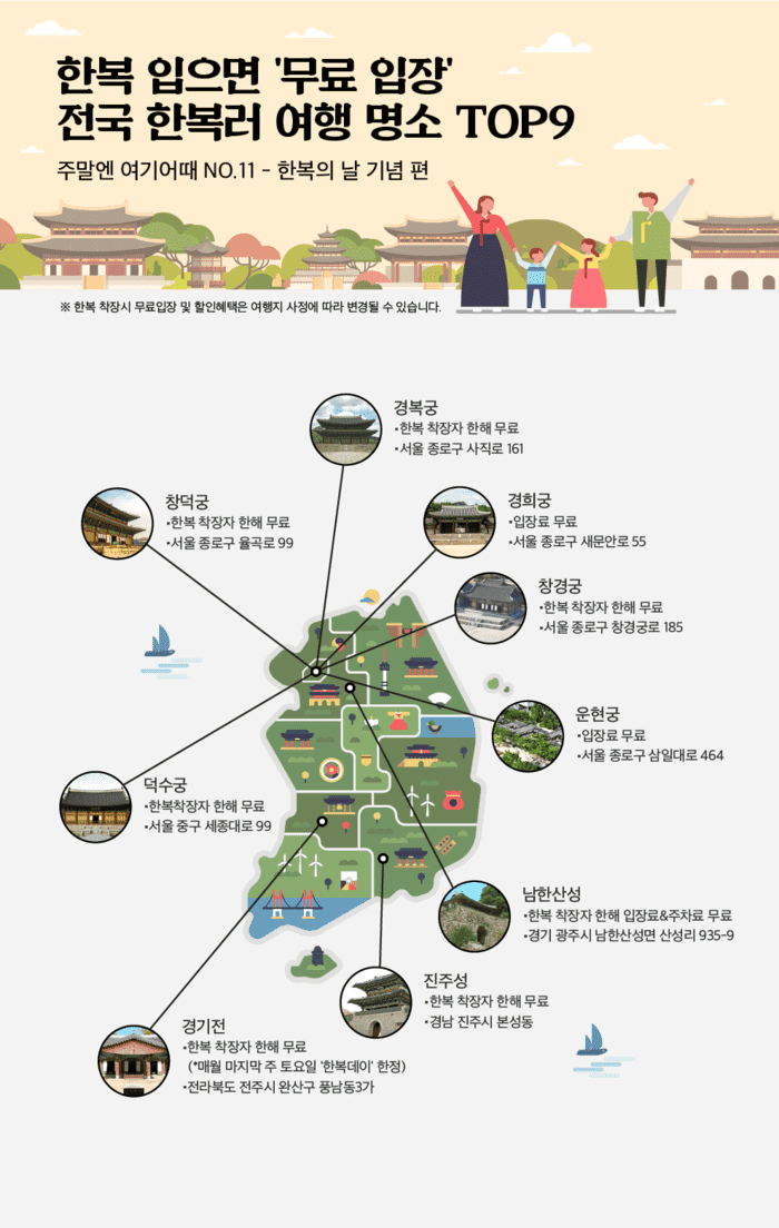 선정된 곳은 ▲창경궁(한복 착장자 한해 무료) ▲덕수궁(한복 착장자 한해 무료) ▲경복궁(한복 착장자 한해 무료) ▲창덕궁(한복 착장자 한해 무료) ▲진주성(한복 착장자 한해 무료) ▲경기전(한복 착장자 한해 ‘한복데이’에 무료, 매월 마지막 주 토요일) ▲남한산성(한복 착장자 한해 입장료&주차료 무료) ▲운현궁 (전 방문객 무료) ▲경희궁(전 방문객 무료) 등 총 9곳이다.