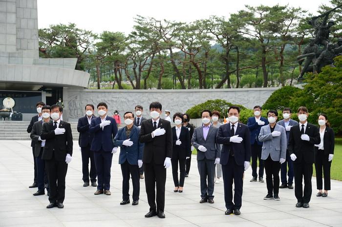 서울 동작구의회가 지난 10일 6월 호국보훈의 달을 맞아 국립서울현충원을 방문해 참배하는 시간을 가졌다. 현충원 참배를 마친 뒤, 전갑봉 의장은 ‘소통과 화합으로 하나 되어 동작구의회를 만들겠습니다’ 라고 방명록에 글을 남겼다. 사진은 동작구의원들이 국기에 대한 경례를 하고 있는 모습. (사진제공=동작구의회)