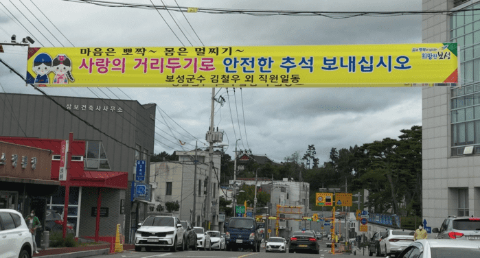 | ▲ 추석맞이 현수막 ‘마음은 뽀짝, 몸은 멀찌기’(출처=보성군청) |