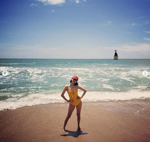 공개된 사진 속 핫펠트는 노란색 수영복을 입고 빨간색 모자를 쓴 채로 사진 촬영을 하고 있다. 군살 없는 완벽한 수영복 몸매가 시선을 사로잡고 있다.