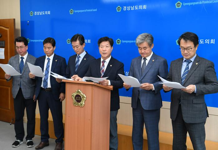 경남도의회 교육위원회 소속 도의원들은 최근 도의회 브리핑룸에서 기자회견을 열고 지역내 고등학교 1학년 2학기 학비 전액을 지원하라고 도교육청에 촉구했다. 사진은 기자회견에서 입장을 밝히는 도의원들의 모습.(사진제공=경남도의회)