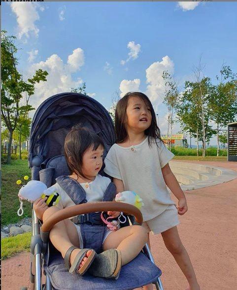 사진은 윤상현-메이비 부부의 사랑스러운 두 딸의 모습을 담고 있다. 푸르른 나무와 파란 하늘이 보는 이들에게도 시원함을 안긴다.