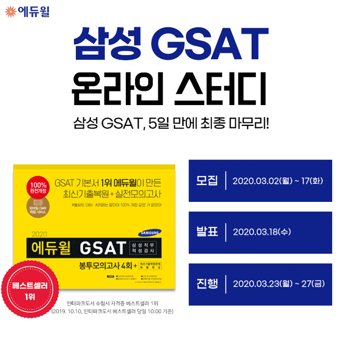 [시민일보 = 황혜빈 기자] 종합교육기업 에듀윌(대표 박명규)이 최근 ‘2020 에듀윌 GSAT 삼성직무적성검사 봉투모의고사 4회’를 출간한 가운데, 오는 17일까지 온라인스터디를 모집한다.