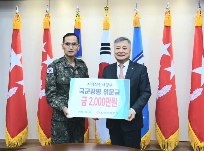 [시민일보 = 여영준 기자] 한국전력은 지난 24일 경기 용인시에 위치해 있는 육군 지상작전사령부를 방문해 장병들의 노고를 위로하고 위문금 2000만원을 전달했다.