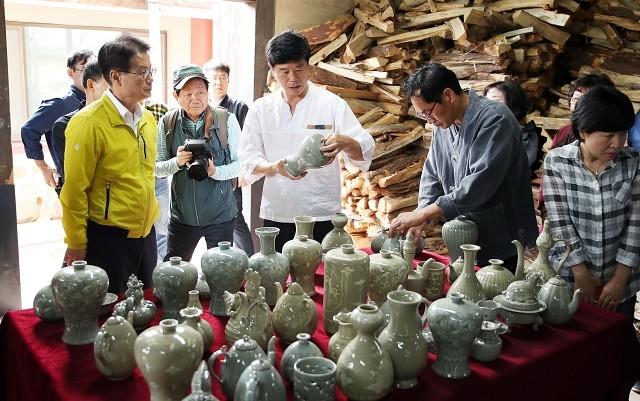 | ▲ 이승옥 강진군수(좌측)가 전통 화목가마에서 출하된 강진청자들을 살펴보고 있다. / 사진=강진군 제공 |