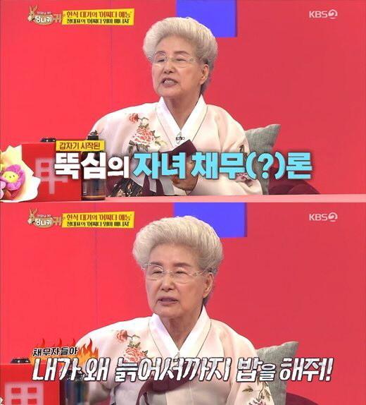 심영순은 “내가 늘 이야기하잖아요. 자식한테는 이자를 놓는 거라고요. 걔네들이 다 컸으면 이제 나한테 빚을 갚아야 되잖아요”라며 “그런데 왜 내가 늙어서까지 밥을 해줘요!”라고 말했다.