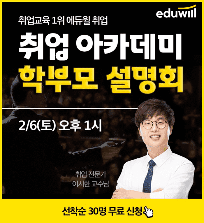 [시민일보 = 여영준 기자] 종합교육기업 에듀윌(대표 박명규) 취업 아카데미 강남캠퍼스가 오는 2월6일 오후 1시 학생과 학부모가 함께하는 ‘학부모 설명회’를 개최한다.