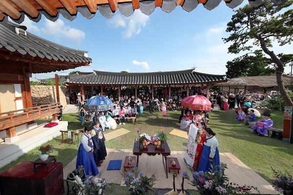 [강진=정찬남 기자] 전남 강진군 사의재 일대(사의재 목민루 야외 공연장)에서 지난 8월 31일 실제 전통혼례가 열렸다.