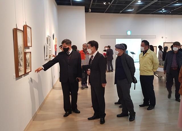 | ▲ 이승옥 군수가 아트페어에서 작가들의 작품을 감상하고 있다. / 사진= 강진군 제공 |