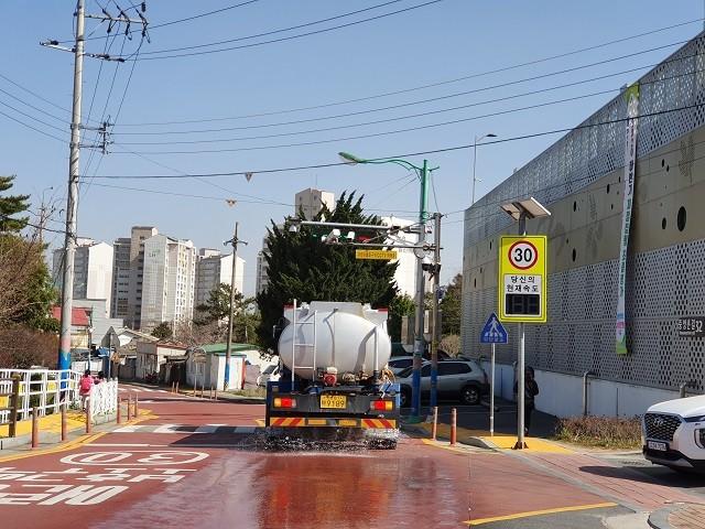| ▲ 영암군, 미세먼지 비상저감을 위해 유동인구가 많은 삼호읍 중앙초 주변 등 주요도로를 중심으로 노면청소 살수차 운영 / 사진=영암군 제공 |