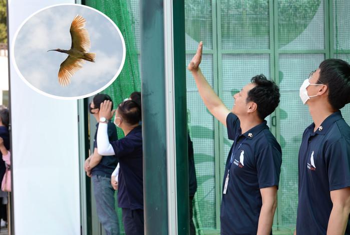 지난 28일 열린 제2회 우포따오기 야생방사 행사에서 창녕군 우포따오기과 직원이 야생방사된 따오기에게 손을 흔들며 안녕을 기원하고 있다
