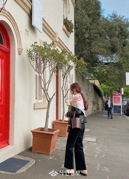 공개된 사진 속 수지는 길거리에서 발견한 한 건물의 빨간 문을 바라보고 있는 모습으로 눈길을 끌었다.
