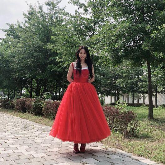 사진 속 한예슬은 발목까지 내려오는 빨간 드레스에 웨이브 진 검은 머리를 늘어트리고 뒷짐을 진 채 미소짓고 있다.