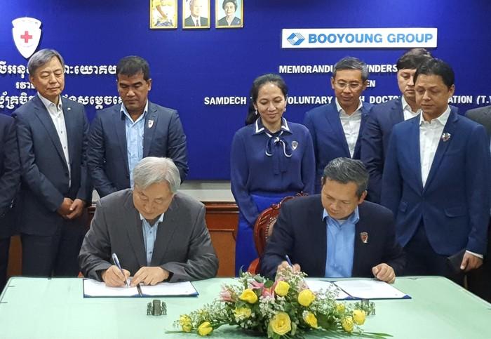 | ▲ 지난 3일 캄보디아 프놈펜의 한 호텔에서 신현석 고문(왼쪽)과 캄보디아 자원봉사 청년의사협회 훈 마넷 회장이 양해각서를 체결하고 있다. (사진제공=부영그룹) |
