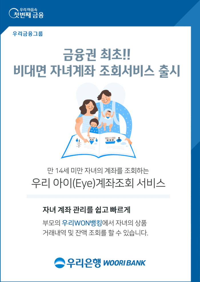 이 서비스는 부모 명의 WON뱅킹을 통해 만 14세 미만 자녀의 ▲입출식예금 ▲정기예적금 ▲주택청약종합저축 상품의 거래내역과 계좌잔액을 쉽고 빠르게 조회할 수 있다.
