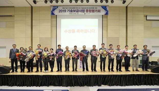 | 해남군, 농업진흥청 주관, "2019 농업기술보급혁신 신기술확산 우수사례 경진대회" 최우수상 수상 기관 단단체 관계자들과 기념촬영 / 사진, 해남군 제공 |