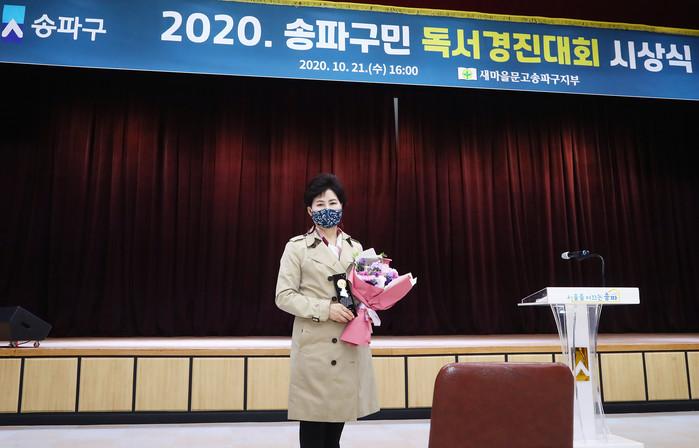 이성자 서울 송파구의원이 최근 구청 4층 대강당에서 열린 ‘2020년 송파구민 독서경진대회’에서 새마을문고송파구지부가 수여하는 감사패를 받았다. 사진은 감사패를 받은 후 기념촬영을 하고 있는 이성자 의원의 모습.(사진제공=송파구의회)