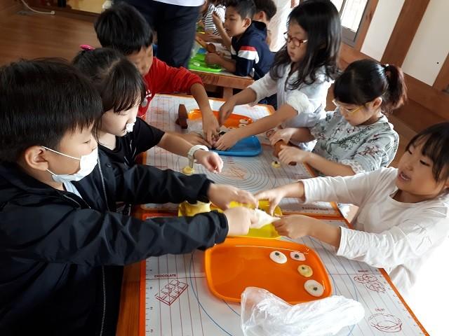 | ▲ 해남군 관내 초등학생들이 고산유물전시관 내 녹우당에서 종가음식체험을 하고 있다. / 해남군 제공 |