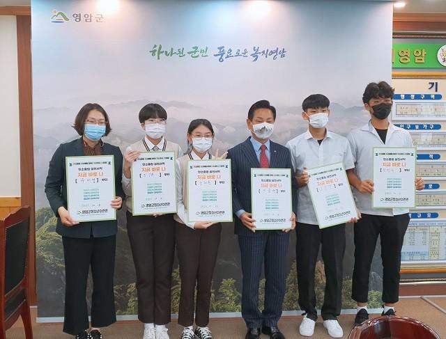 | ▲ 전동평 영암군수(우측부터 3번)와 관내 청소년들, 15일 탄소배출 최소화 실천을 위한 선언 및 서약식 후 기념촬영 / 사진=영암군 제공 |