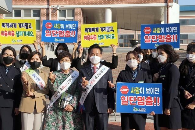 | ▲ 전동평 영암군수(가운데), 대불초 교통안전 캠페인 동참 / 사진=영암군 제공 |