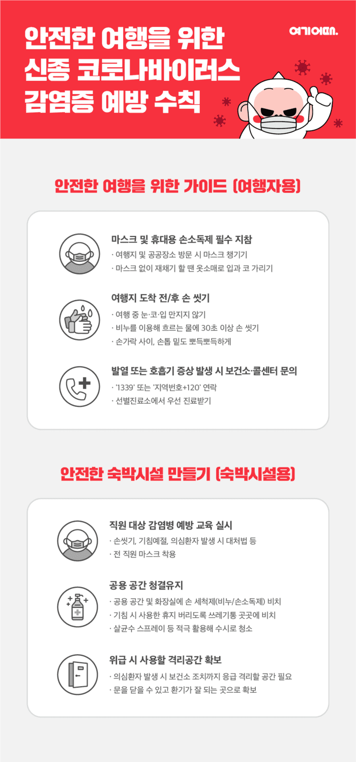 [시민일보 = 고수현 기자] 국내 대표 종합숙박·액티비티 예약서비스 여기어때가 신종 코로나 바이러스 감염증 예방을 위한 안전 수칙을 여행객과 숙박시설에 안내했다.