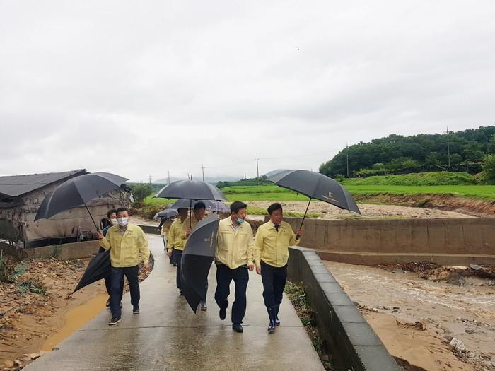 경기도의회 더불어민주당 박근철 대표의원(의왕1)은 3일 집중호우로 제방이 무너진 이천시 율면의 산양저수지 현장을 방문해 신속한 피해복구 및 인명피해가 발생하지 않도록 만전을 기할 것을 부탁했다. 사진은 현장을 살피는 박 대표의원의 모습. (사진제공=경기도의회)