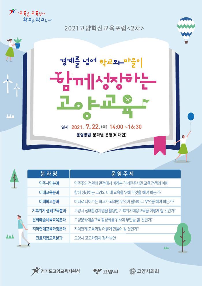 고양혁신교육포럼은 ‘함께 가는 고양교육’을 통해 교육공동체가 교육을 위한 협력의 필요성을 공감하고, ‘함께 성장하는 고양교육’, ‘함께 실천하는 고양교육’을 통해 지역사회가 함께 성장하고 실천하는 과정을 경험하며, ‘함께 그려보는 고양교육’이라는 주제로 고양의 미래교육을 함께 설계해보고자 4회의 포럼으로 진행되고 있다.