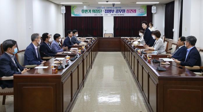 인천 남동구의회 제8대 후반기 신임 의장단은 최근 의회 중회의실에서 이강호 구청장을 포함한 집행부 공무원과 상견례를 했다. 이날 상견례에는 임애숙 의장, 정재호 부의장, 이정순 의회운영위원장, 김윤숙 총무위원장, 오용환 사회도시위원장과 이 구청장을 비롯한 집행부 공무원 등 14명이 참석했다. 사진은 상견례 모습. (사진제공=남동구의회)