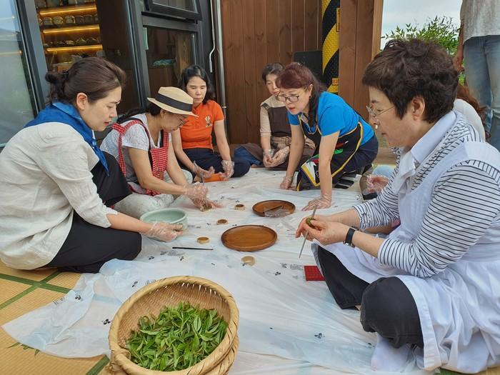 최근 전남 보성군 보림제다에서 목포대학교 평생대학원 학생들을 대상으로 ‘떡차 만들기 체험’을 진행했다. 사진은 지도 강사의 지도에 따라 떡차를 만들고 있는 교육 참가자들의 모습. (사진제공=보성군청)
