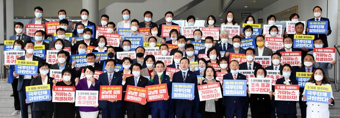 광주시의회와 광주 지역 5개 자치구의회 의원들이 6일 광주시의회에서 기자회견을 열어 5.18 민주화운동 40주년에 맞춰 광주에서 열릴 예정인 보수단체의 집회를 취소하라고 촉구하고 있다.