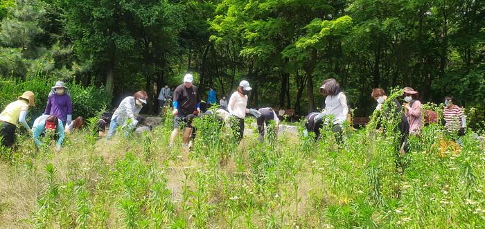경기 안산시 상록구 성포동 행정복지센터 직원들과 성포동 통장협의회는 핑크뮬리 식재로 재조성해 노적봉의 새로운 사진 명소로 시민들의 발길이 끊이지 않았던 노적봉 핑크뮬리 정원을 재정비했다. 사진은 도깨비 가지와 잡초를 제거하고 있는 직원과 협의회원들의 모습. (사진제공=안산시청)