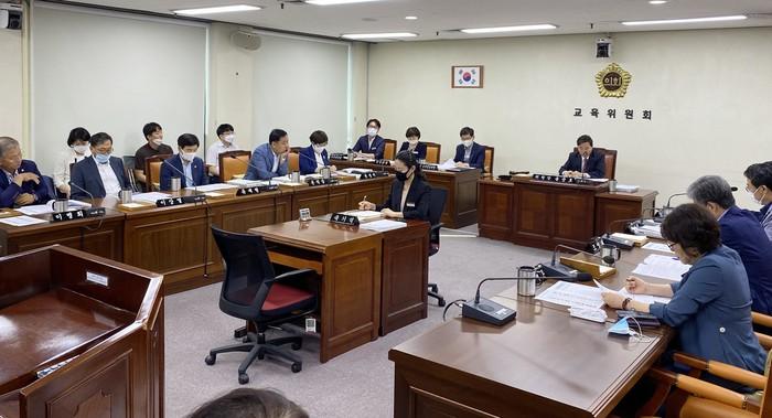 경남도의회 교육위원회는 15일 열린 제377회 임시회 교육위원회 회의에서 최근 경남에서 교사들의 학교 화장실 불법촬영 카메라 설치 사건이 잇따라 적발된 것과 관련해 경남도교육청에 강력한 처벌과 재발방지 대책 수립을 촉구하는 정책질의를 했다. 사진은 교육위 회의 모습.