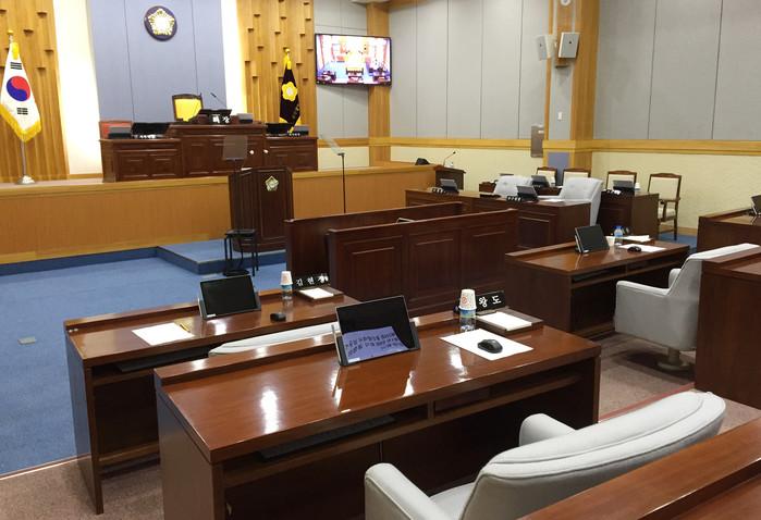 후반기 원 구성을 두고 벌어진 여·야 의원들의 갈등으로 울산 남구의회 정례회가 8일 파행됐다. 이날 정례회 장소인 남구의회 본회의장이 텅 비어 있다.