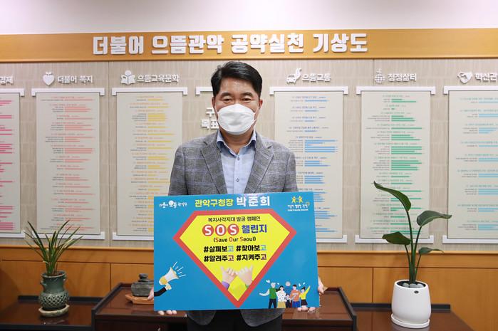 박준희 서울 관악구청장이 지난 10일 사회적 약자에 대한 폭력을 예방하고, 복지사각지대의 점진적 해소를 위해 주변 사회적 약자를 ‘살펴보고, 찾아보고, 알려주고, 지켜주자’는 취지의 캠페인 ‘복지 사각지대 발굴 SOS(Save Our Seoul) 챌린지’에 동참했다. 사진은 박 구청장이 챌린지에 동참하는 모습. (사진제공=관악구청)