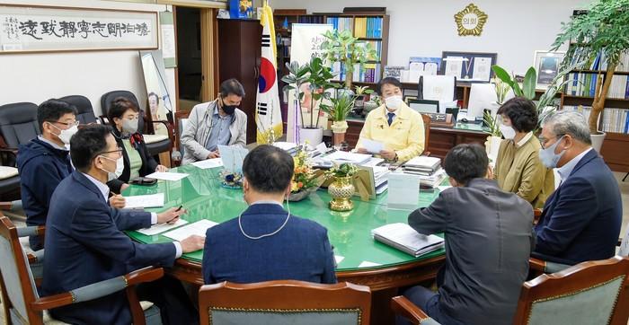 전남 순천시의회가 지역내에서 급격히 확산되고 있는 코로나19의 재유행을 막기 위해, 8~14일 열릴 예정이던 제250회 임시회를 연기한다. 이번 임시회 연기는 이번 주가 지역내 코로나19 재확산을 막는 결정적인 고비가 될 것으로 판단됨에 따라, 시의 모든 행정력을 전염병 확산 방지에 집중하기 위해 6일 긴급 의장단회의와 의회운영위원회를 소집해 결정했다. 사진은 허유인 의장(가운데) 및 의원들이 회의하고 있는 모습. (사진제공=순천시의회)