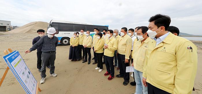 충남 서산시의회가 최근 ‘간월호 준설사업 현장’을 방문해 사업현황에 대한 설명을 듣고 개선방안을 논의했다. 사진은 현장을 방문한 의원들이 현장 관계자로부터 사업에 대한 설명을 듣고있는 모습. (사진제공=서산시의회)