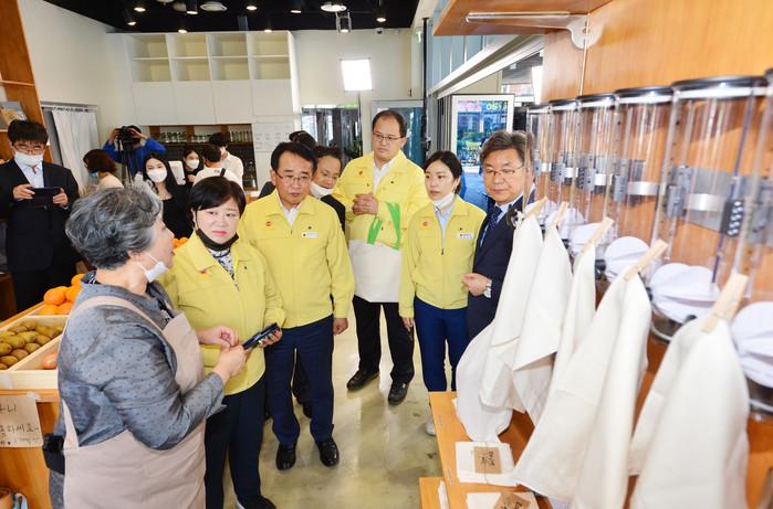 울산시의회 전영희 환경복지위원장을 비롯한 의원들은 최근 남구 일자리종합센터에서 열린 울산 최초 포장재 없는 가게 '제로웨이스트 숍'을 방문해 행사장을 둘러본 뒤 관계자들을 격려했다. 사진은 관계자로부터 설명을 듣는 의원들의 모습. (사진제공=울산시의회)