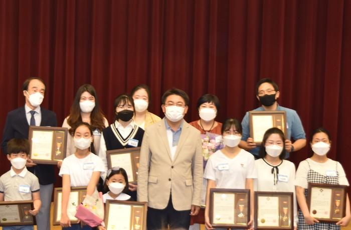 오승록 서울 노원구청장이 지난 5일 '제26회 환경의 날 기념식'에 참석했다. 기념식은 환경문제에 대해 생각해 보고 환경보호를 위한 실천의지를 다지고자 개최됐다. 사진은 기념식에서 오 구청장(앞줄 가운데)이 환경공모전 수상자들과 기념사진을 촬영하고 있는 모습. (사진제공=노원구청)