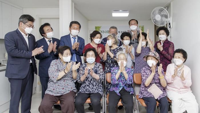 서울 마포구는 최근 연남동에 위치한 '느티나무 경로당 개소식'을 개최했다. 구는 코로나 19방역 계획에 따라 시설 방역과 사전점검을 통해 안전하게 운영할 방침이다. 사진은 개소식에 참석한 유동균 구청장(뒷줄 오른쪽)과 정청래 국회의원 및 관계자들이 기념촬영을 하는 모습. (사진제공=마포구청)