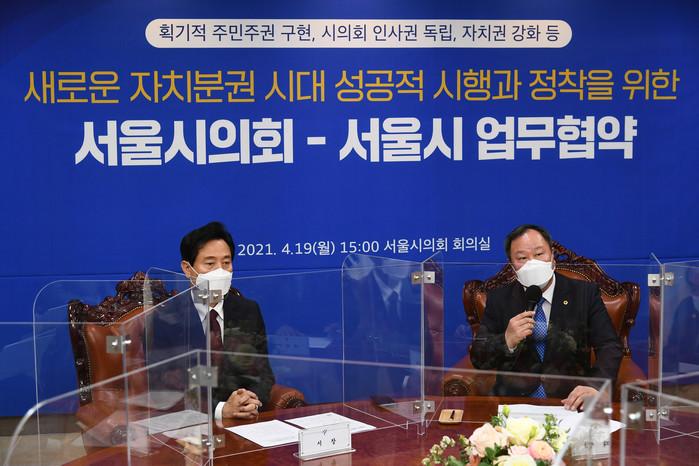 김인호 서울시의회 의장이 19일 오후 서울 중구 서울시의회에서 열린 '서울시의회-서울시 업무협약식'에서 발언하고 있다.