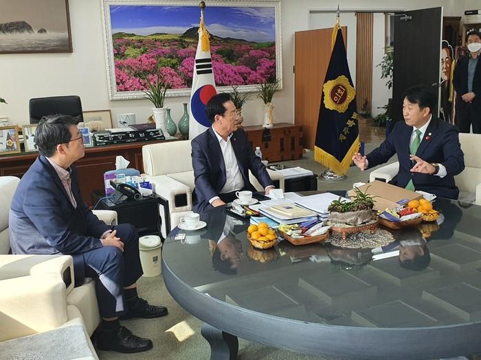 허유인 전남 순천시의회 의장이 최근 제주도의회를 방문, 좌남수 의장을 만나 ‘2023순천만국제정원박람회’와 잡월드 홍보물을 전달하고 홍보자료에 대해 자세한 설명을 했다. 사진은 허유인 순천시의장(오른쪽)이 좌남수 제주도의장(가운데)와 이야기를 나누고 있는 모습. (사진제공=순천시의회)